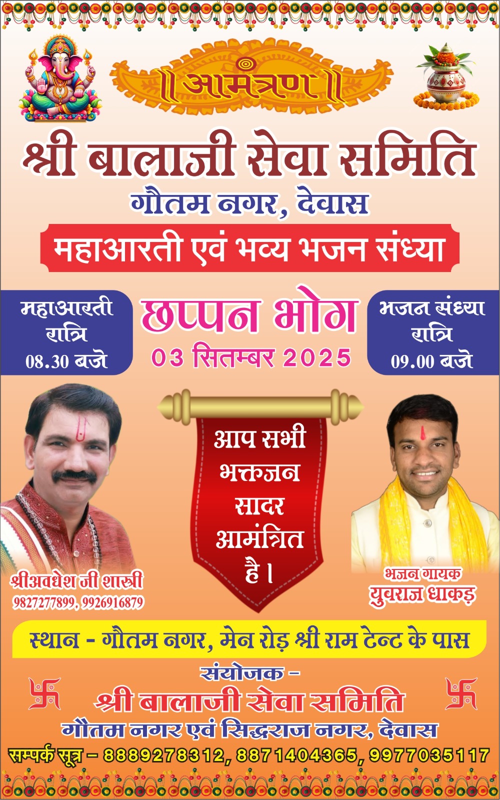 देवास। श्री बालाजी सेवा समिति, गौतम नगर द्वारा भव्य धार्मिक आयोजन किया जा रहा है। समिति के जगदीश गोयल एवं अवधेश शास्त्री ने बताया कि कार्यक्रम के अंतर्गत महाआरती एवं भव्य भजन संध्या का आयोजन 3 सितम्बर 2025 को किया जाएगा। इस अवसर पर छप्पन भोग भी अर्पित किया जाएगा। महाआरती का आयोजन रात 8.30 बजे होगा, जिसके बाद रात 9 बजे से भजन संध्या का शुभारंभ होगा। भजन गायक युवराज धाकड़ अपनी प्रस्तुतियों से भक्तों को भक्ति रस में डुबोएंगे। यह आयोजन गौतम नगर, मेन रोड स्थित श्री राम टेंट के पास होगा। समिति ने सभी भक्तजनों से इस कार्यक्रम में सम्मिलित होकर आशीर्वाद प्राप्त करने की अपील की है।