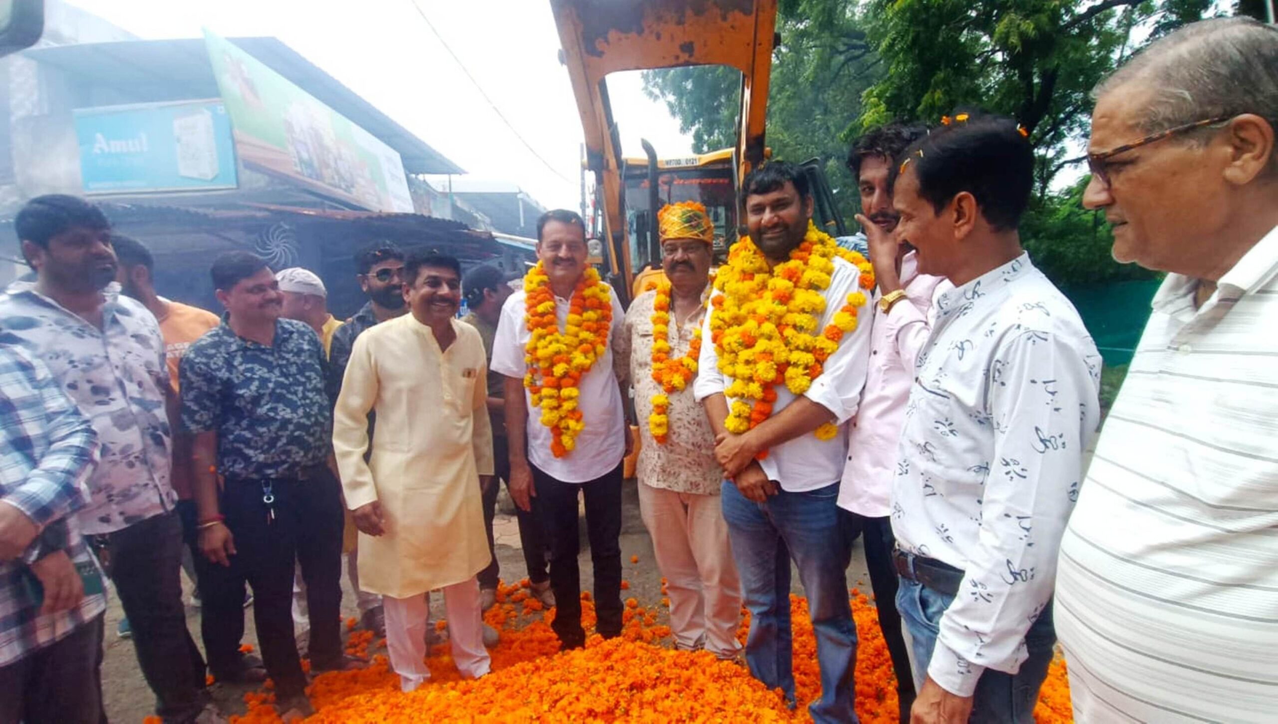 जेसीबी से फूलों की वर्षा कर जिला कांग्रेस ग्रामीण अध्यक्ष श्री चौधरी व शहर अध्यक्ष श्री गौतम का किया स्वागत