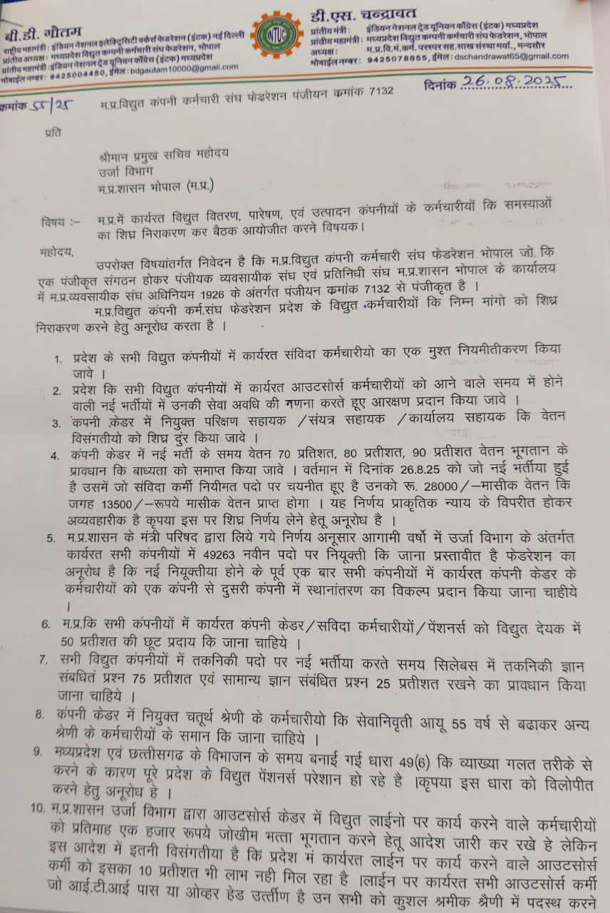 मप्र विद्युत कंपनी कर्मचारी संघ फेडरेशन ने सरकार से रखीं 15 बड़ी मांगें, शीघ्र बैठक बुलाने का किया आग्रह