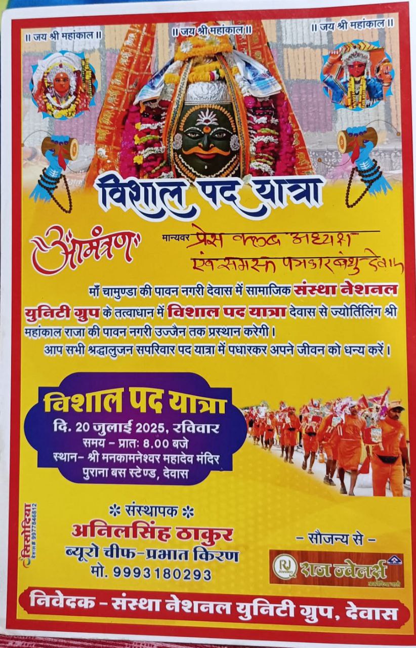 20 जुलाई को देवास से उज्जैन बाबा महाकालेश्वर तक निकलेगी पदयात्रा – नेशनल यूनिटी ग्रुप द्वारा भव्य पदयात्रा का आयोजन