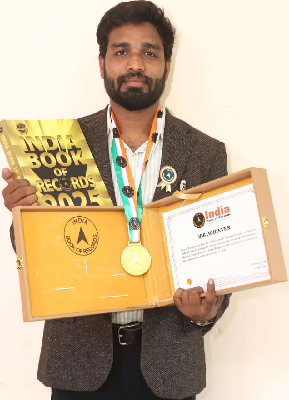 देवास। शहर के सिया गांव के होनहार संगीतकार मनीष देव ने संगीत के क्षेत्र में एक अनोखा रिकॉर्ड कायम किया है। उन्होंने मात्र 17 मिनट 31 सेकंड में 28 विभिन्न वाद्ययंत्र बजाकर इंडिया बुक ऑफ रिकॉर्ड्स में अपना नाम दर्ज कराया है। मनीष ने हारमोनियम, मेलोडिका, काज़ू, युकुलेले, गिटार, बोंगो, डजेम्बे जैसे भारतीय और पाश्चात्य वाद्ययंत्रों पर अपनी सधी हुई पकड़ और प्रतिभा का प्रदर्शन किया। उनकी इस उपलब्धि की 23 जून 2025 को इंडिया बुक ऑफ रिकॉर्ड्स द्वारा आधिकारिक पुष्टि की गई। इस खास मौके पर मनीष ने अपनी सफलता का श्रेय माँ के आशीर्वाद और गुरुजनों के मार्गदर्शन को दिया। उन्होंने कहा, “माँ का आशीर्वाद और गुरुजनों का मार्गदर्शन ही मेरी प्रेरणा रहा है।” उनकी इस उपलब्धि से देवास शहर में खुशी की लहर है, और संगीत प्रेमियों के बीच मनीष देव एक प्रेरणास्रोत बनकर उभरे हैं।